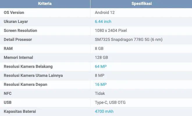 Di bagian belakang terdapat tiga kamera utama yang terdiri dari sensor 64 MP + 8 MP + 2 MP, dan kamera depan dengan resolusi 16 MP. Baterai kapasitas 4700 mAh didukung oleh teknologi FlashCharge 66W untuk pengisian daya yang cepat.