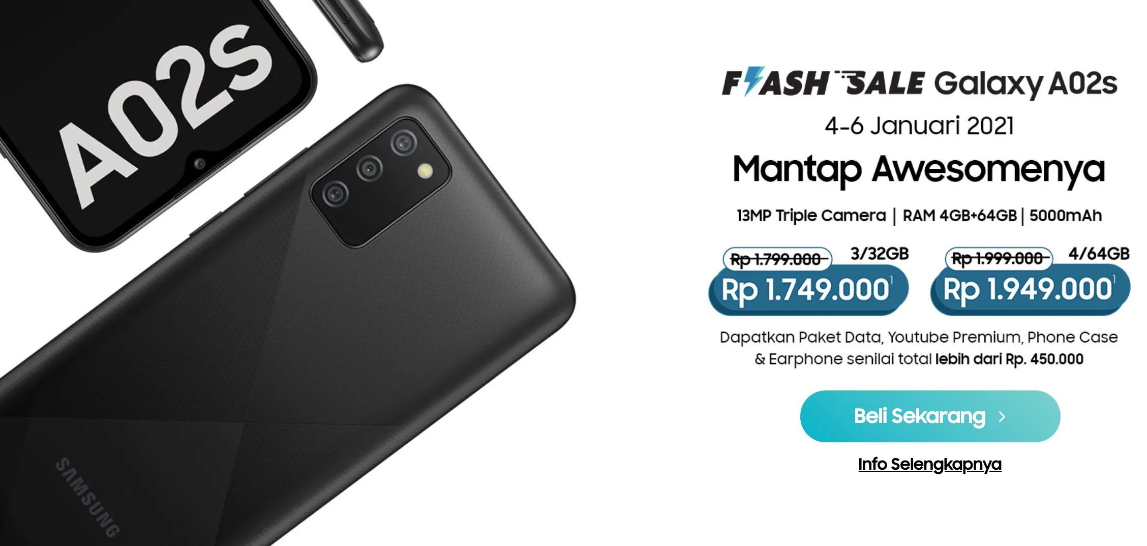 Kabar gembiranya, ada harga khusus yang ditawarkan selama flash sale. Galaxy A02s varian 3/32 GB dibanderol dengan harga Rp 1.749.000. Sementara varian 4/64 GB menjadi Rp 1.949.000.