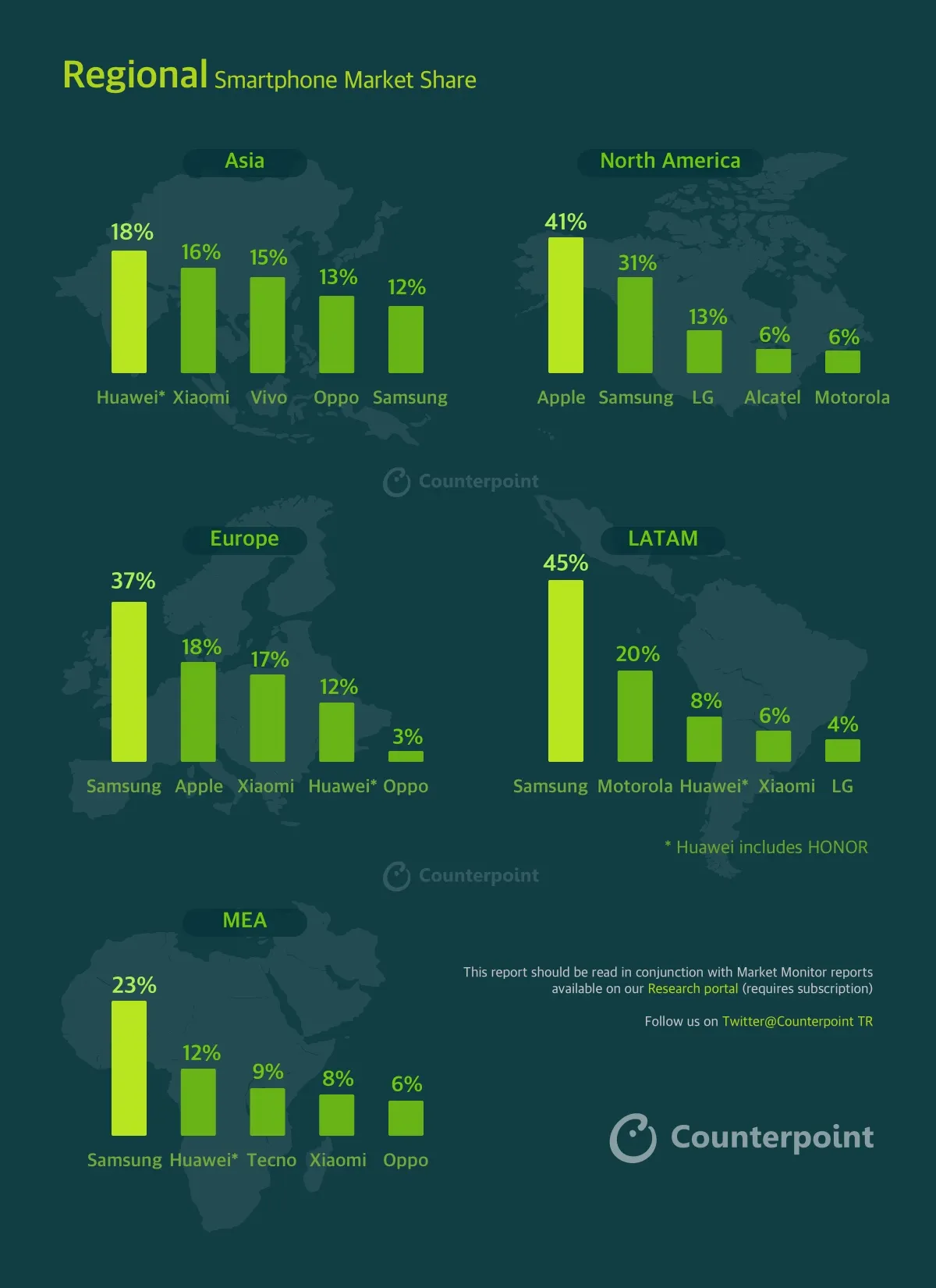 Dari segi brand, Samsung menjadi brand yang tidak hanya memimpin Global Smartphone Market, tetapi juga memimpin tiga dari lima pasar regional besar yaitu Eropa, LATAM (Latin America/Amerika Latin), dan MEA (Middle East/Timur Tengah dan Afrika). Di sisi lain, Huawei meraih peringkat pertama di Asia, sedangkan Apple merajai pasar Amerika Utara.