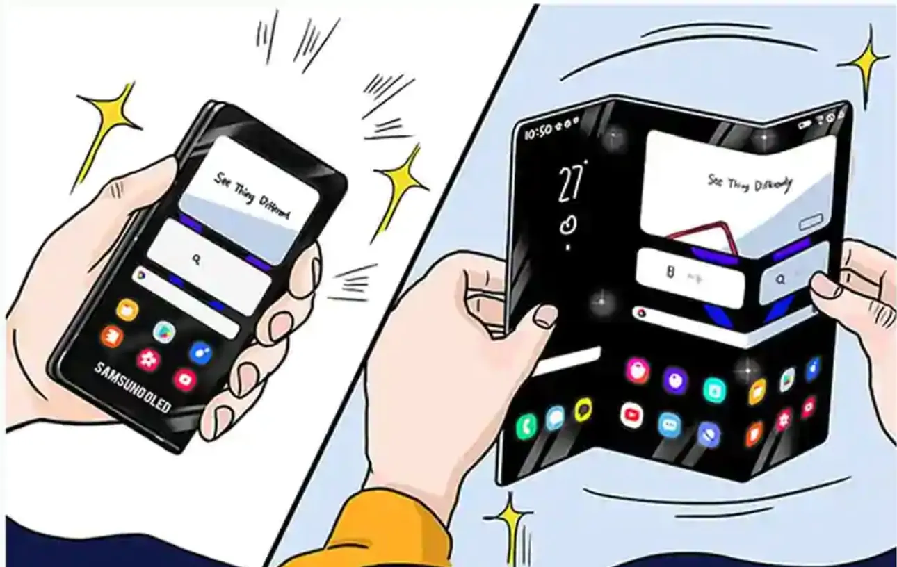 Pada sketsa pertama menunjukan perangkat dengan layar berkemampuan dilipat hingga tiga kali, mirip seperti desain Samsung Galaxy Fold, disertai dengan logo kecil dibagian bawah bertuliskan “Samsung OLED”.