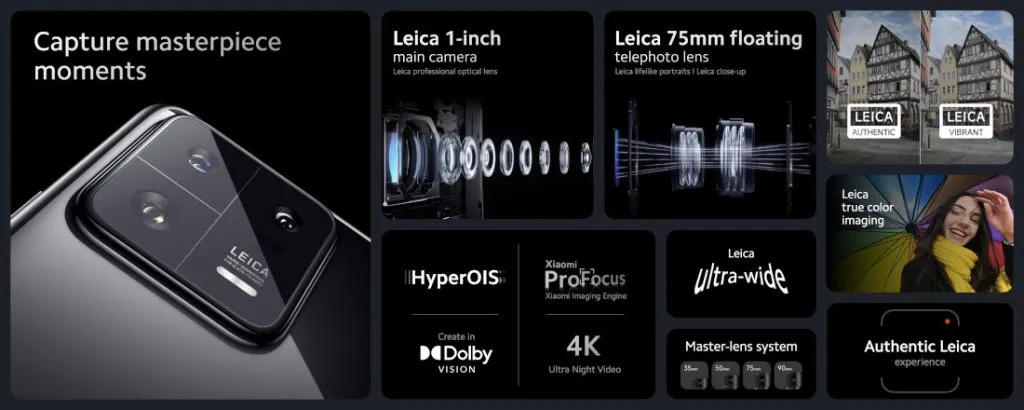 Sementara itu, Xiaomi 13 Pro dilengkapi dengan tiga kamera belakang 50MP dengan kamera utama yang menampilkan sensor Sony IMX989 ultra-besar 1 inci, optik Leica, 8 lensa asferis, lapisan pantulan ultra-rendah ALD, lapisan tinta tepi lensa, bahan olefin siklik baru, dan filter IR proses spin-coated untuk mencapai kualitas optik yang sama dengan Xiaomi 12S Ultra. Selain itu, terdapat juga dukungan HyperOIS.