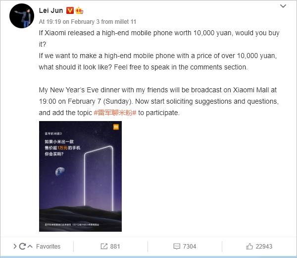 "Jika Xiaomi merilis ponsel kelas atas seharga 10.000 yuan, apakah kamu akan membelinya?" tulis Lei Jun.