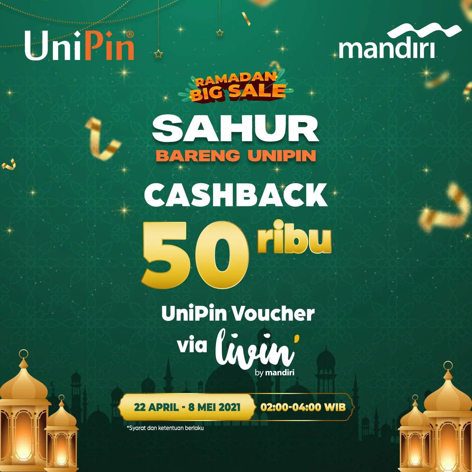 Khusus pada 22, 24, 29 April dan 1,6,8 Mei 2021, lanjutnya, nasabah juga berkesempatan mendapatkan cashback hingga Rp50.000 untuk setiap transaksi minimal Rp100.000 di antara pukul 02.00 - 04.00 WIB dalam program Sahur Bareng UniPin di aplikasi Livin’by Mandiri.