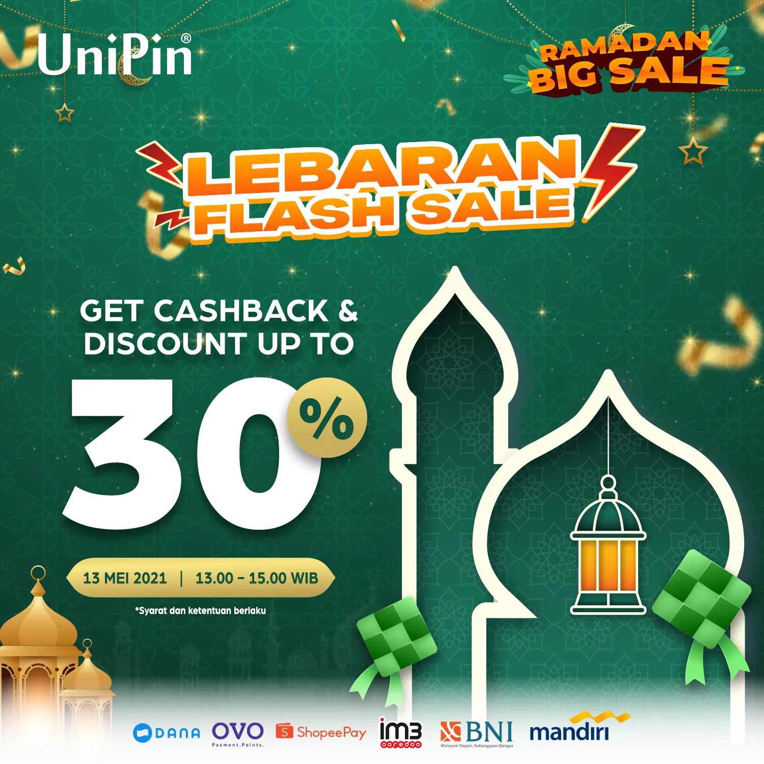 Tak hanya itu, Bank Mandiri juga telah menyiapkan program promo istimewa pada saat Hari Raya Idul Fitri, 12-13 Mei 2021 agar hari kemenangan menjadi semakin bermakna. Melalui Lebaran Flash Sale, nasabah akan menikmati cashback sebesar Rp20.000 untuk pembelian UniPin Voucher senilai minimal Rp300.000 pada pukul 13.00 - 15.00 WIB saja.