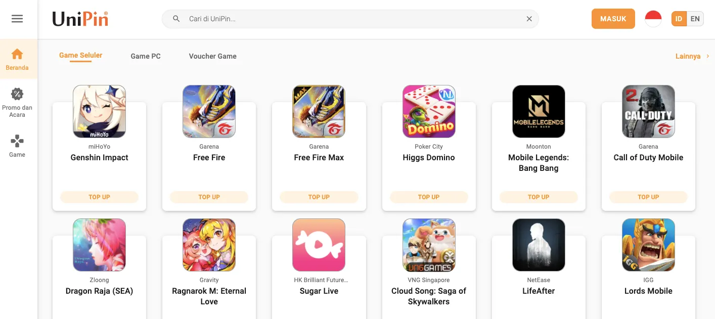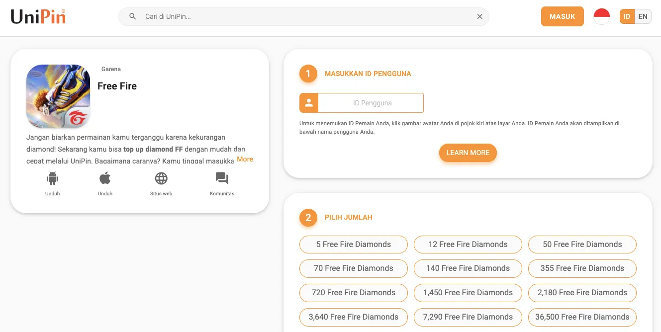 1. Buka web UniPin.com, lalu masuk ke halaman top up game yang kamu inginkan. Misalkan kalau mau top up diamond Free Fire, maka bisa masuk ke halaman top up Free Fire. Atau kalau mau beli diamond Mobile Legends bisa masuk ke halaman Mobile Legends.