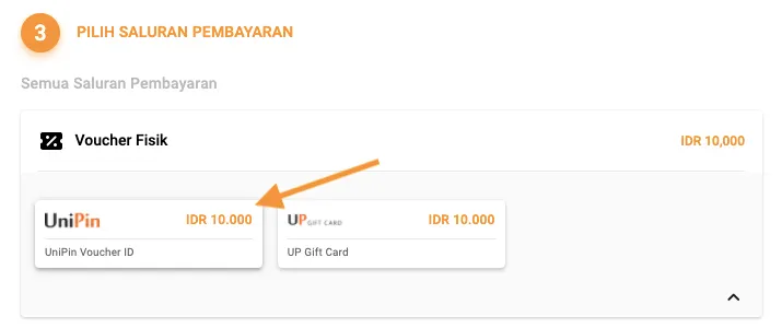 3. Di bagian metode pembayaran, tinggal pilih voucher fisik, lalu pilih unipin voucher.