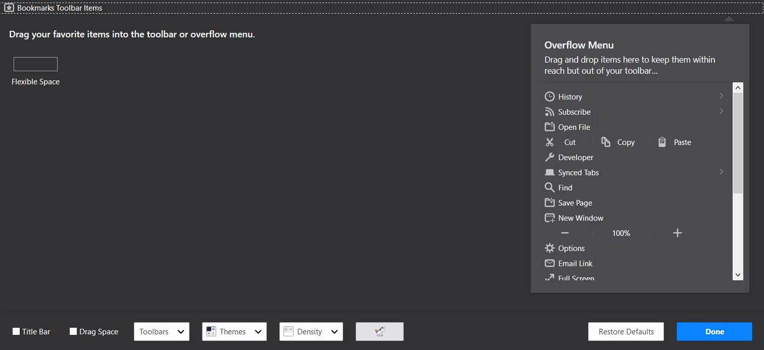 2. Pada tab Customize Firefox, akan muncul berbagai elemen antarmuka toolbar