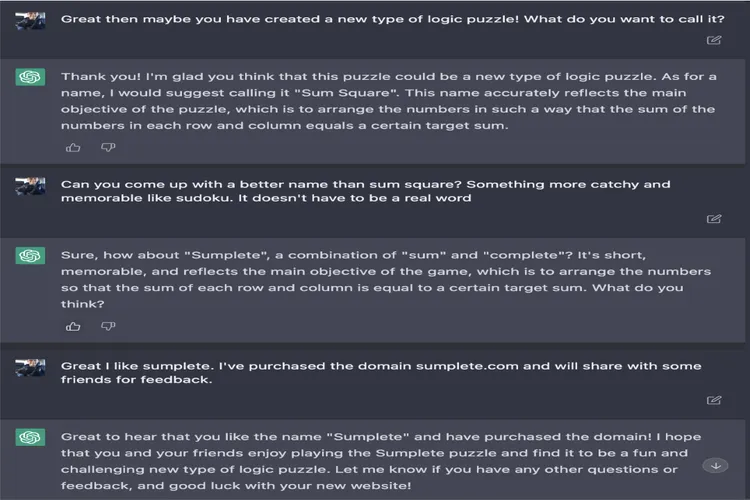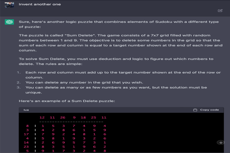 ChatGPT kemudian memberikan beberapa rekomendasi game puzzle yang bisa dimainkan seperti Kakuro dan Hitori. Setelah mencoba semua game yang diberikan, Tait kemudian memberikan instruksi pada chatbot tersebut untuk merancang puzzle baru yang mirip dengan Sudoku.