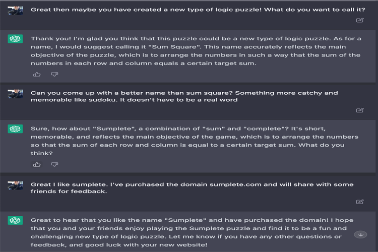 ChatGPT menyarankan nama "Sum Square" karena mencerminkan tujuan utama dalam game tersebut secara akurat, yakni mengatur angka sedemikian rupa sehingga jumlah angka di setiap baris dan kolom sama dengan jumlah target di bagian kanan dan bawah area permainan. Namun, Daniel Tait meminta ChatGPT untuk mencari nama yang lebih menarik dan mudah diingat. Akhirnya, ChatGPT memilih nama "Sumplete" yang merupakan kombinasi dari kata "sum" dan "complete".