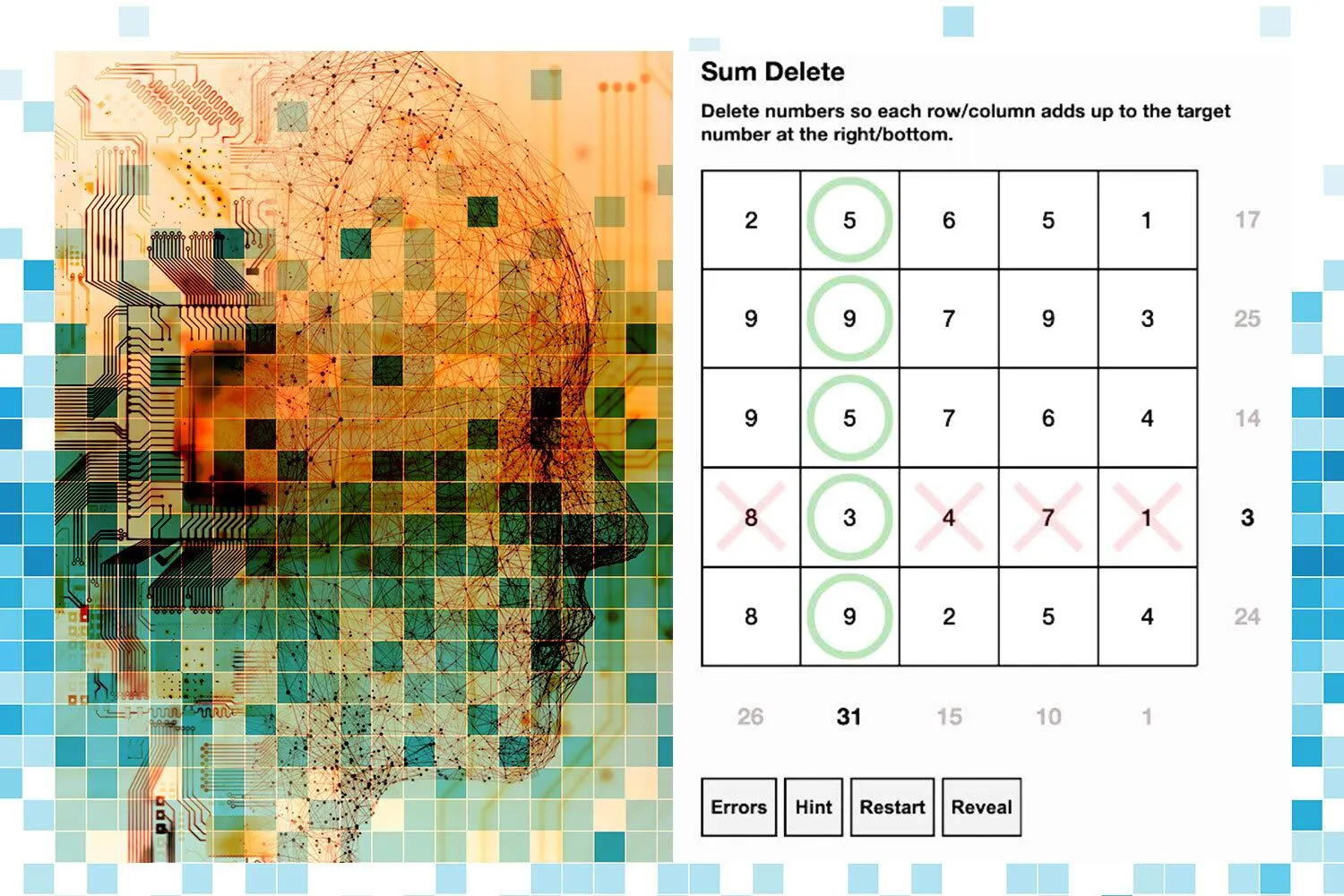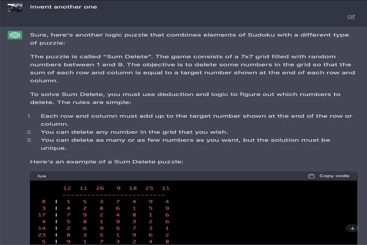 Permainan "Sum Delete" yang dirancang oleh ChatGPT memiliki konsep yang berbeda dengan Sudoku. Pada permainan ini, pemain diminta untuk menghapus angka yang terdapat dalam area permainan berukuran 7x7. Namun, pemain juga harus memastikan bahwa total angka yang tersisa ketika dijumlahkan sama dengan angka target yang terdapat di bagian kanan dan bawah area permainan.
