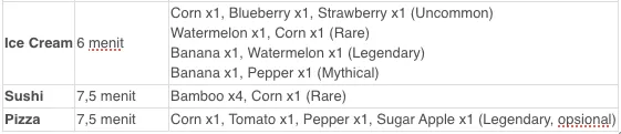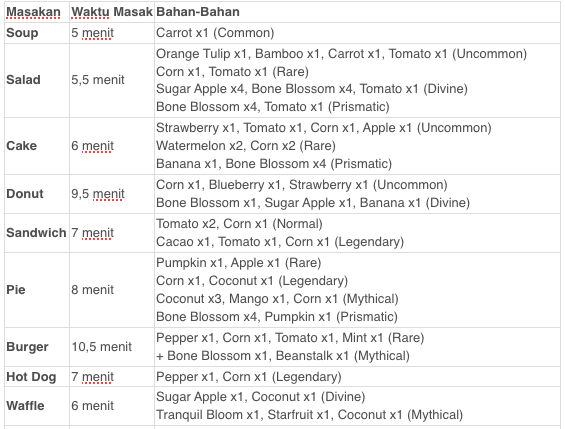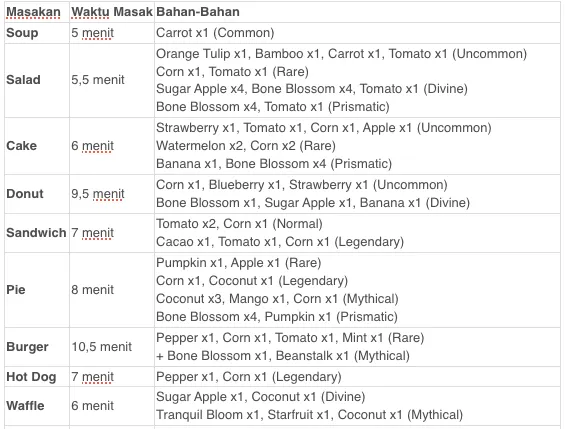 Berikut daftar lengkap resep masakan di Grow a Garden Roblox, termasuk bahan-bahan dan estimasi waktu memasak: