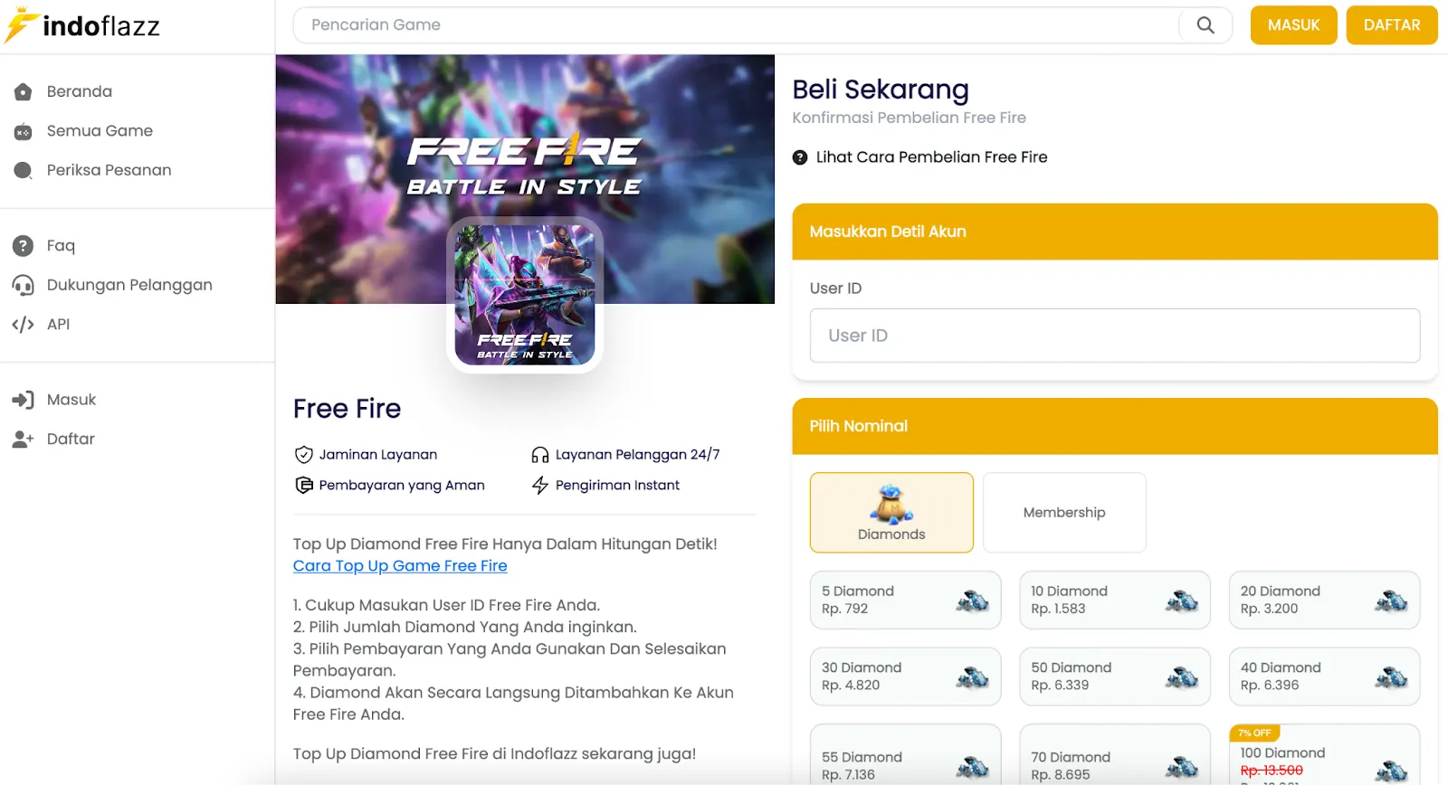 Nah, untuk meningkatkan kekuatan karakter, top up diamond Free Fire menjadi salah satu solusi yang banyak diandalkan para gamers. Di tengah maraknya layanan top up ff murah, Indoflazz muncul sebagai opsi menarik. Mari kita bahas secara rinci bagaimana cara top up Free Fire di Indoflazz dan apa kelebihan yang ditawarkan. Sebelum masuk ke dalam detail top up ff di Indoflazz, mari kita bahas beberapa keseruan bermain Free Fire. Dunia yang penuh dengan aksi, strategi, dan tentu saja, persaingan ketat. Ketika bermain, kita seringkali dihadapkan pada situasi di mana memiliki lebih banyak diamond bisa menjadi kunci keberhasilan. Diamond digunakan untuk membeli item-item keren seperti skin senjata, karakter, hingga aksesori yang dapat meningkatkan performa kita di medan perang. Namun, untuk mendapatkan diamond dengan cepat, top up menjadi pilihan yang paling efektif. Aktivitas top up ini tidak hanya mempercepat kemajuan kita dalam permainan, tetapi juga memberikan pengalaman bermain yang lebih seru dan variatif. Dengan begitu, kita dapat fokus pada strategi dan keahlian kita tanpa harus terlalu khawatir tentang keterbatasan aset dalam game. Dengan begitu banyaknya layanan top up diamond Free Fire yang bertebaran di internet, kita harus bijak dalam memilihnya. Penting untuk memastikan bahwa kita menggunakan layanan yang terpercaya agar tidak terkena tipu atau risiko lainnya. Berikut adalah beberapa tips memilih layanan top up game yang dapat dipercaya: Sebuah layanan top up yang bagus biasanya memiliki banyak testimoni positif dari pelanggan sebelumnya. Membaca pengalaman orang lain dapat memberikan gambaran tentang seberapa andal dan cepat layanan tersebut. Perhatikan nama domain website tempat kita melakukan top up. Hindari website dengan nama domain yang mencurigakan atau tidak jelas. Layanan yang baik biasanya menggunakan nama domain yang terkait dengan nama perusahaan atau layanan yang mereka tawarkan. Website yang rapi dan mudah dipahami menunjukkan profesionalisme penyedia layanan. Jika tampilan website terlihat acak dan membingungkan, sebaiknya kita berpikir ulang sebelum menggunakan layanan tersebut. Pastikan terdapat informasi mengenai customer support yang dapat dihubungi jika kita mengalami masalah atau membutuhkan bantuan. Layanan yang baik selalu siap memberikan respons cepat terhadap pertanyaan atau keluhan pelanggan. Indoflazz hadir sebagai pilihan yang layak untuk top up diamond Free Fire. Beberapa kelebihan layanan top up game Free Fire di Indoflazz antara lain: Indoflazz memberikan jaminan layanan yang dapat dipercaya. Dengan reputasi yang baik, pemain dapat top up dengan nyaman tanpa khawatir mengenai keamanan dan kelancaran transaksi. Ketika kita butuh bantuan atau menghadapi masalah, Indoflazz menyediakan layanan pelanggan 24/7. Ini memberikan kenyamanan ekstra karena kita dapat menghubungi mereka kapan saja, tanpa terikat pada jam kantor. Keamanan transaksi adalah prioritas utama Indoflazz. Dengan menggunakan sistem pembayaran yang terpercaya, kita dapat yakin bahwa data pembayaran kita aman dan tidak akan disalahgunakan. Keunggulan lain dari Indoflazz adalah pengiriman diamond secara instan setelah proses pembayaran selesai. Kita tidak perlu menunggu terlalu lama untuk menikmati aset yang baru kita dapatkan. Untuk mempermudah pengguna, berikut adalah tutorial singkat cara top up game Free Fire di Indoflazz: 1. Masukkan User ID Free Fire Anda Pertama-tama, masukkan User ID Free Fire Anda dengan benar. Pastikan untuk memeriksa kembali agar tidak terjadi kesalahan yang tidak diinginkan. 2. Pilih Jumlah Diamond yang Diinginkan Pilih jumlah diamond yang ingin Anda top up. Indoflazz menyediakan pilihan jumlah yang beragam, sesuai dengan kebutuhan dan keinginan kita. 3. Pilih Metode Pembayaran dan Selesaikan Pembayaran Pilih metode pembayaran yang paling sesuai dengan preferensi kita. Indoflazz menyediakan berbagai opsi pembayaran, termasuk transfer bank, e-wallet, dan lainnya. Setelah itu, lengkapi proses pembayaran sesuai petunjuk yang diberikan. 4. Diamond Langsung Ditambahkan ke Akun Free Fire Anda Setelah pembayaran selesai, diamond akan langsung ditambahkan ke akun Free Fire Anda. Anda dapat langsung menggunakan diamond tersebut untuk melakukan pembelian in-game sesuai keinginan. Jika Anda mencari alternatif top up game dengan harga merakyat, aman, dan terpercaya, indoflazz.com adalah pilihan yang tepat. Dengan layanan 100% legal, 24/7 non-stop, dan transaksi yang mudah, Indoflazz siap membantu pemain Free Fire untuk mendapatkan diamond dengan cepat dan aman. Dengan begitu, tidak perlu khawatir lagi tentang kekurangan aset dalam permainan. Kunjungi indoflazz.com sekarang dan nikmati pengalaman bermain Free Fire yang lebih seru dan memuaskan!Tips Memilih Layanan Top Up yang Terpercaya