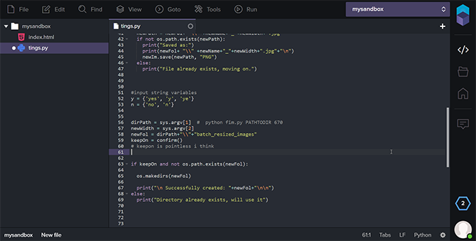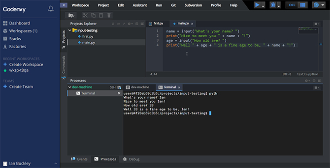Python IDE online harus cepat, mudah digunakan, dan memiliki terminal untuk pengujian. Codenvy menyediakan semua hal ini dan lebih banyak lagi.