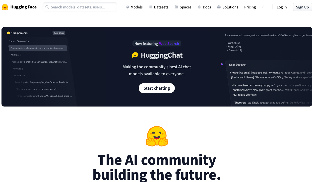 Hugging Face adalah platform yang menawarkan alat kecerdasan buatan gratis untuk generasi kode dan pemrosesan bahasa alami. Dengan memanfaatkan model GPT-3 yang kuat, Hugging Face memungkinkan tugas generasi kode seperti autolengkapan dan ringkasan teks. Dengan kemampuan pemahaman bahasanya yang luas, Hugging Face memberikan bantuan berharga kepada para pengembang dalam menulis kode berkualitas tinggi dengan efisien.