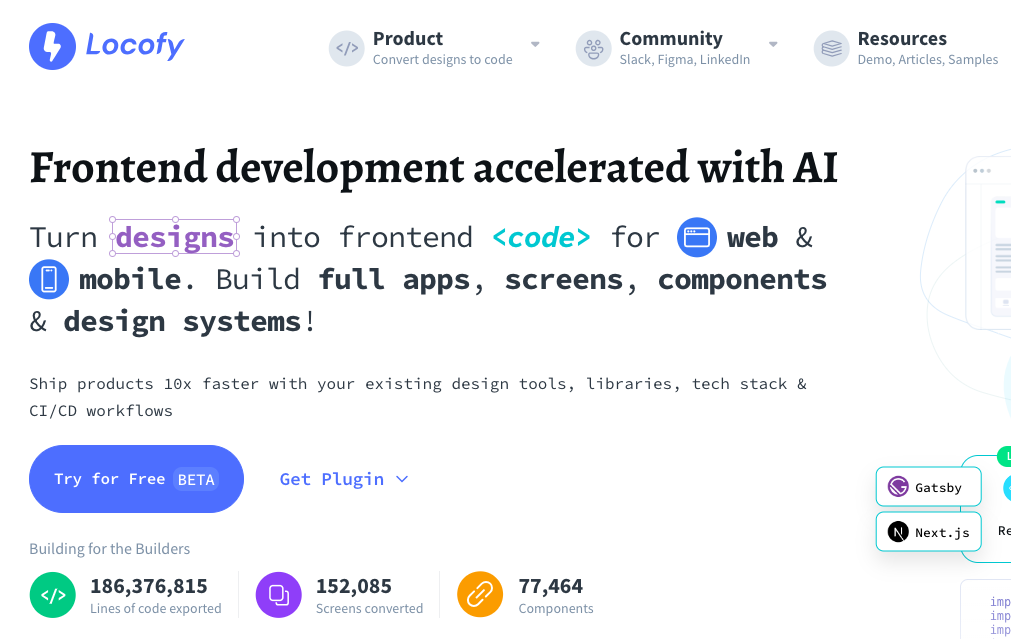Locofy memberdayakan pengguna untuk mengonversi desain mereka menjadi kode front-end untuk aplikasi seluler dan web. Dengan dukungan untuk alat desain populer seperti Figma dan Adobe XD, Locofy menghasilkan kode siap produksi untuk kerangka kerja seperti React, React Native, HTML/CSS, Gatsby, dan Next.js. Alat ini menjembatani kesenjangan antara desain dan pengembangan, membuat proses implementasi lebih efisien.