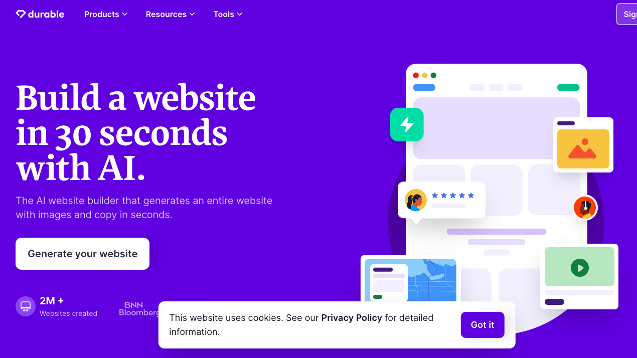 Durable menawarkan pembuat situs web berkecerdasan buatan yang secara otomatis membuat seluruh situs web dengan foto dan teks dalam hitungan detik. Dengan memanfaatkan kecerdasan buatan, Durable menentukan lokasi pengguna dan menghasilkan situs web unik yang disesuaikan dengan kebutuhan bisnis mereka. Tanpa memerlukan pengkodean atau keahlian teknis apa pun, Durable memungkinkan pengguna untuk dengan cepat membuat kehadiran online.