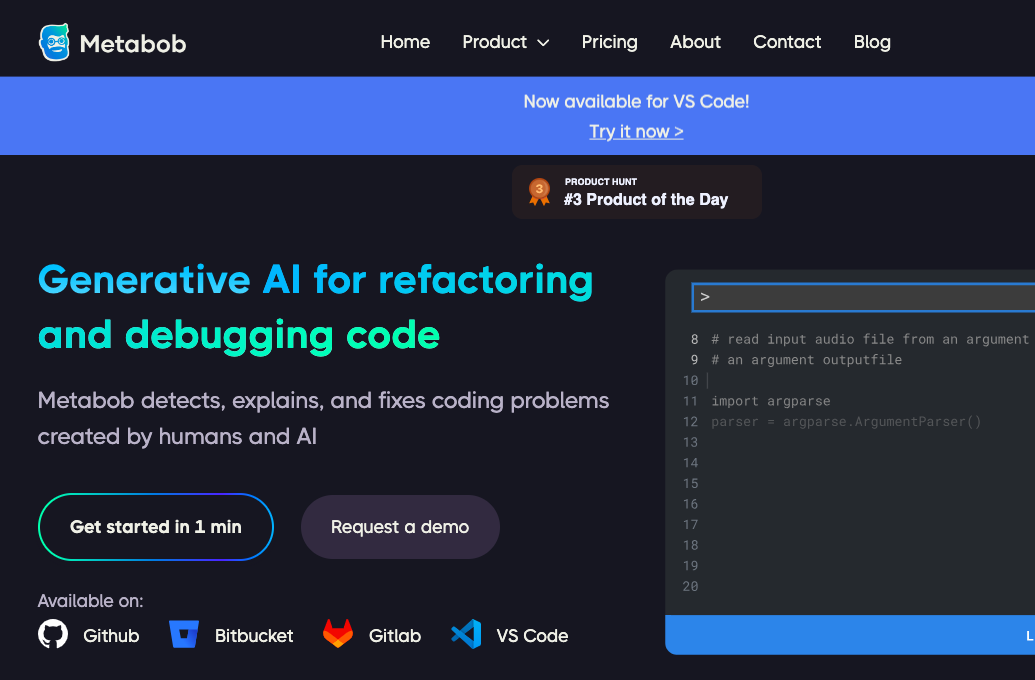 Metabob adalah alat analisis kode statis yang memanfaatkan kecerdasan buatan untuk mengidentifikasi dan menyelesaikan masalah tersembunyi dalam kode sebelum digabungkan. Dengan memberikan wawasan yang dapat diterapkan mengenai kualitas dan keandalan kode proyek, Metabob memungkinkan pengembang untuk memberikan perangkat lunak yang lebih tangguh dan bebas kesalahan. Kompatibel dengan bahasa pemrograman yang umum digunakan dan dapat diakses di platform seperti VS Code dan GitHub, Metabob menyederhanakan proses peninjauan kode dan memastikan integritas kode.