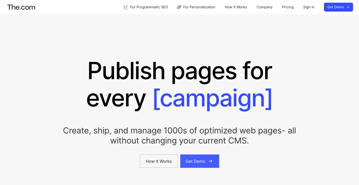 The.com adalah platform yang mengotomatiskan pembuatan situs web dan halaman web secara besar-besaran. Ini memberikan kemampuan bagi bisnis untuk menambah ribuan halaman ke situs web mereka setiap bulan, mempercepat kehadiran online dan pertumbuhan mereka. Dengan mengotomatiskan pembuatan situs web, The.com mengurangi waktu dan usaha yang dibutuhkan untuk pengembangan web, memungkinkan bisnis untuk fokus pada aspek kritis lain dari operasional mereka.