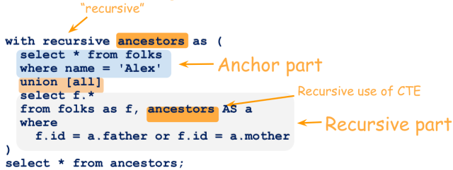 Dikenal juga sebagai CTE, hal ini merupakan konsep yang didukung dalam kebanyakan database relasional.Pada dasarnya, CTE adalah tampilan yang ditentukan berdasar kueri dalam cakupan kueri tersebut. CTE bukan merupakan objek database, CTE ada sebagai bagian dari kueri. CTE juga mudah dibaca jika dilakukan dengan baik.