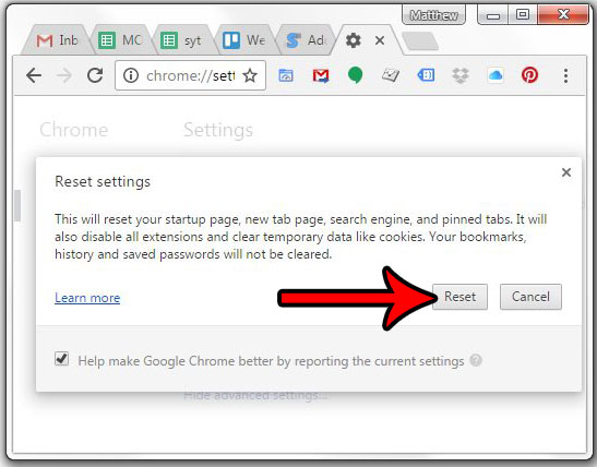 laptop, hapus iklan dengan menyetel ulang browser Chrome, yakni: