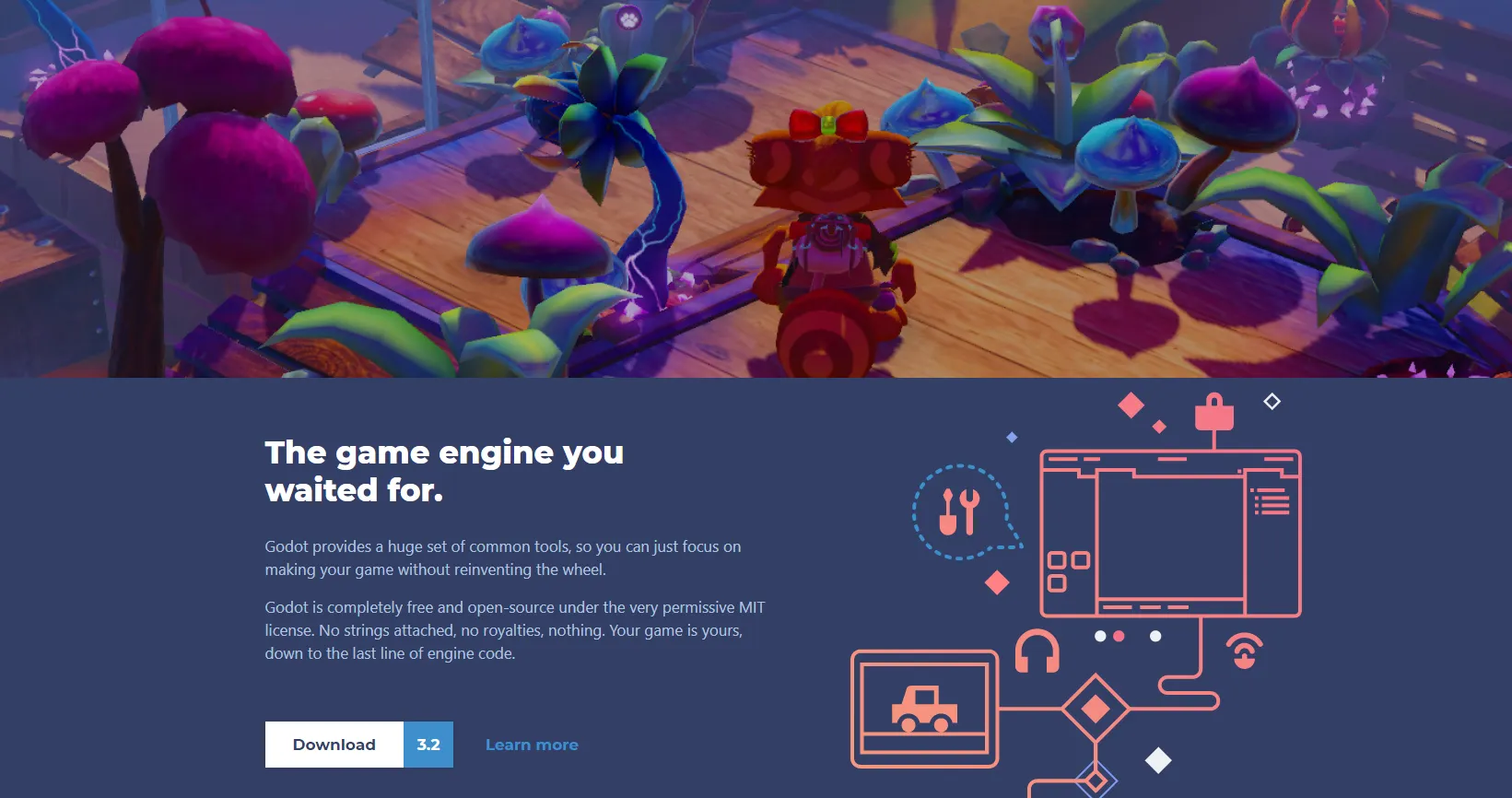 Godot adalah solusi untuk mengembangkan game 2D maupun 3D lintas platform yang bisa kamu gunakan secara gratis. Bahasa pemrograman yang didukung Godot antara lain adalah C++, C# dan GDScript. Godot juga mudah diprogram dan dipelajari bagi para pemula dengan fitur scene dan node untuk kemudahan pengembangan game.
