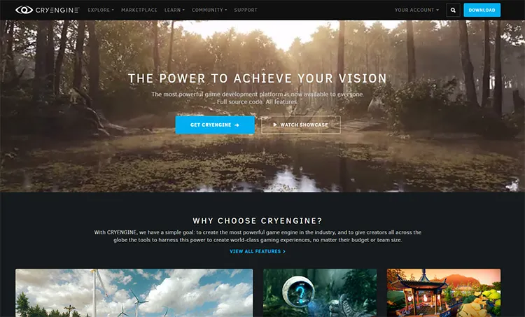 CryEngine adala game machine untuk menghadirkan grafik canggih 3D. Dengan dukungan VR dan efek visual yang canggih, CryEngine sangat menarik untuk para pengembang yang ingin membuat game dengan grafik yang realistis seperti foto atau game pada platform generasi terbaru. Jika kamu ingin mengembangkan game tingkat tinggi, mungkin harus mempertimbangkan menggunakan game engine ini.