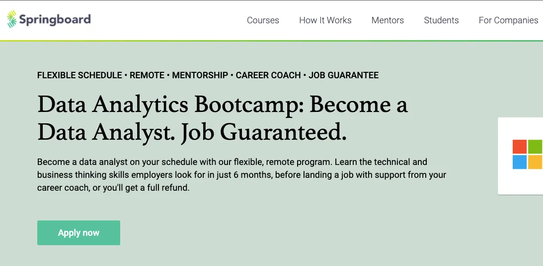 Program Big Data Analytics Bootcamp adalah program selama enam bulan yang difokuskan pada karier dan menjamin lulusan untuk mendapatkan pekerjaan. Program ini didesain oleh Springboard bersama Microsoft.