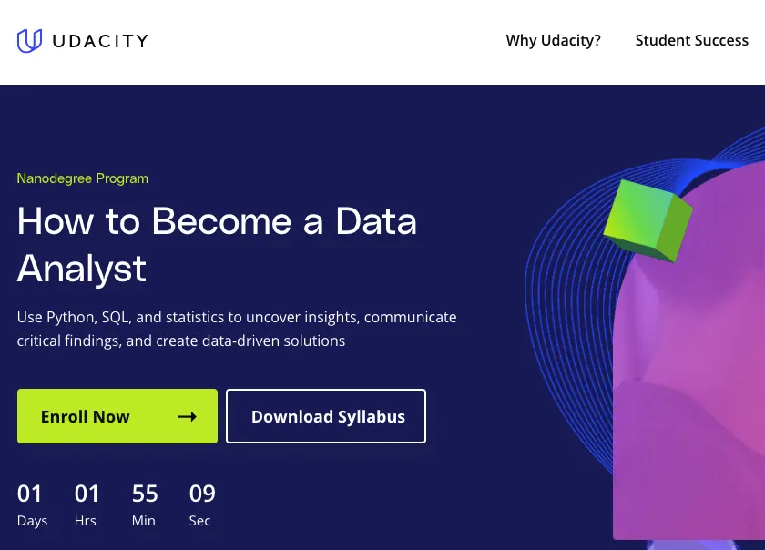 Program Nanodegree Data Analyst dari Udacity akan memberikan kamu semua pengetahuan, keterampilan, dan peralatan yang dibutuhkan untuk memulai karir di bidang analisis data besar. Selain membahas teori dan praktek, program ini juga menyediakan sesi mentor secara teratur, komunitas siswa yang aktif, dan layanan dukungan karir yang unik.