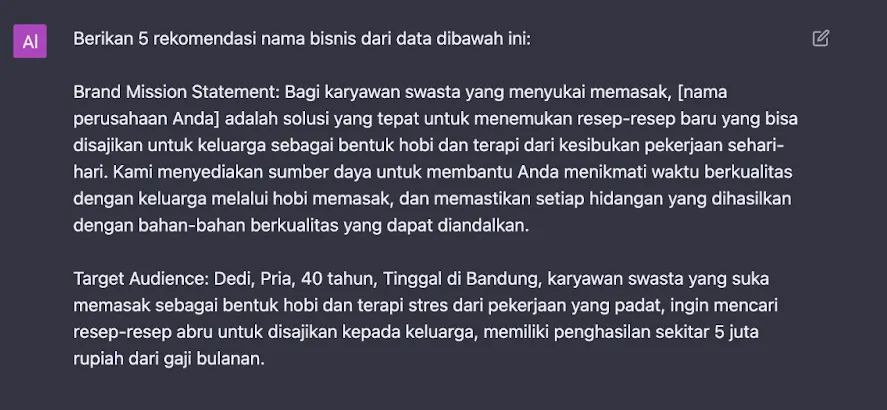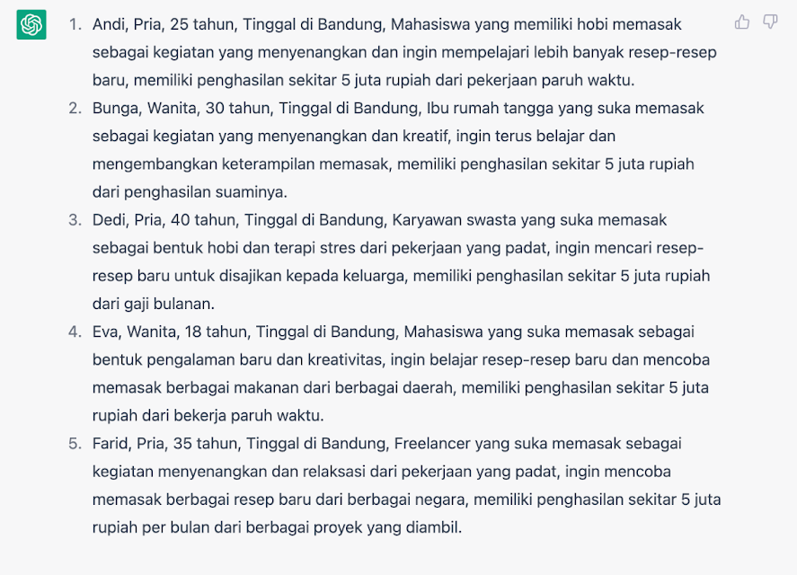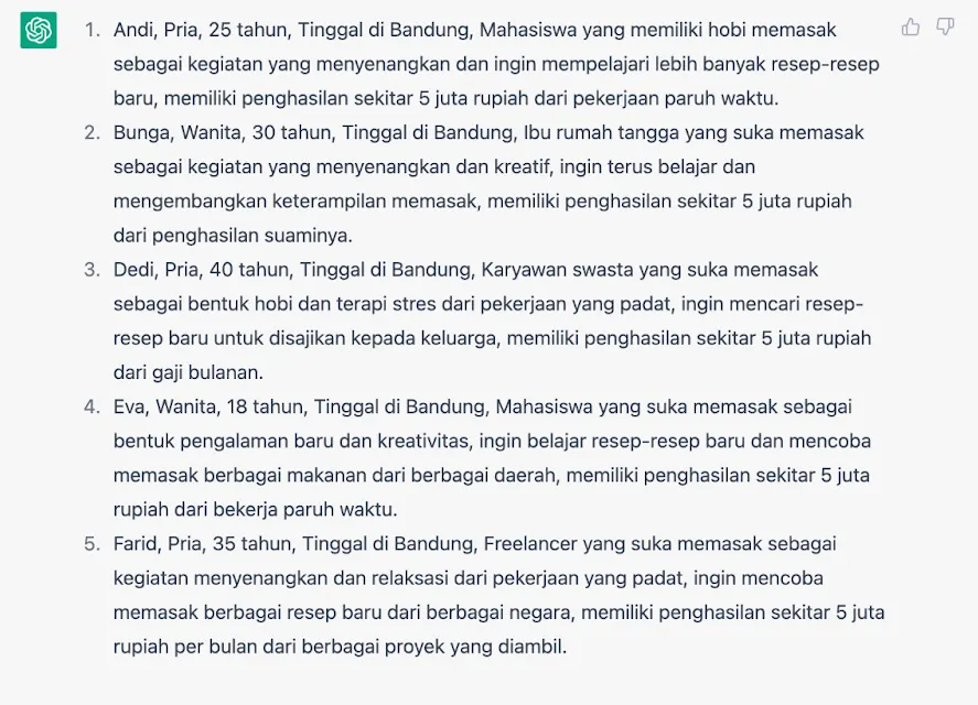 Disini kita bisa manfaatkan ChatGPT untuk membuat user persona untuk target audience. User persona adalah karakter fiktif untuk target audience bisnis yang menyangkup semua aspek dari beberapa pertanyaan tersebut. Kita bisa menanyakan hal ini kepada ChatGPT.