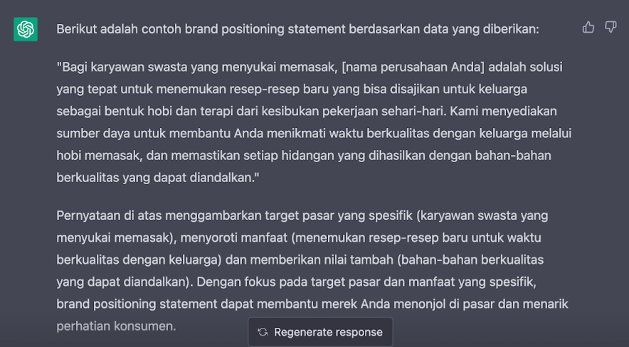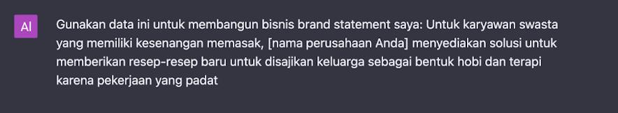 Jika kesusahan untuk membuat brand positioning statement bisnis, kalian dapat memberikan perintah prompt seperti ini kepada ChatGPT.