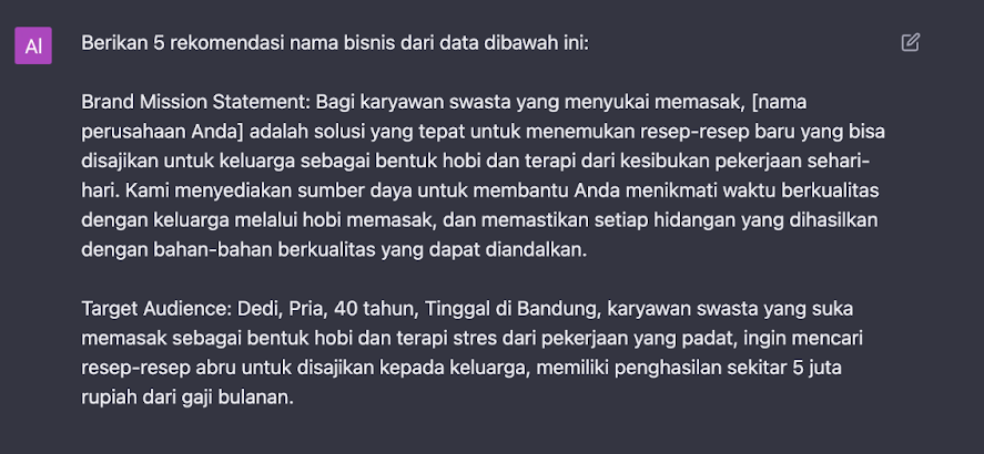 Untuk mendapatkan nama brand saat ini banyak sekali AI generator yang bisa kita gunakan. Salah satunya, kita bisa menggunakan Chatbot ChatGPT untuk mendapatkan beberapa nama yang bisa kita pakai untuk brand kita. Kita tinggal memasukan pertanyaan.
