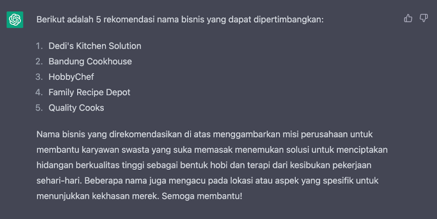 Salah satunya dalam sektor bisnis, teknologi AI Chatbot ChatGPT dapat membantu kita terkait bagaimana mengembangkan bisnis yang baik, menentukan target audience, dan memberitahu bisnis apa yang saat ini sedang dibutuhkan.