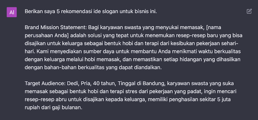 Perlu diingat, meskipun AI (Artificial Intellegence) atau kecerdasan buatan sangat membantu dan memudahkan kita dalam membuat bisnis. Namun, kita juga jangan terlalu bergantung kepada AI, lebih baik kita memanfaatkan informasi yang diberikan AI, lalu modifikasi sesuai dengan pemikiran kita terhadap identitas dan value brandnya.