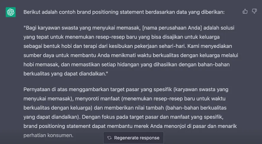 Ilustrasi Chatbot ChatGPT yang merespon dalam membuatkan brand positioning statement. Foto: ChatGPT.