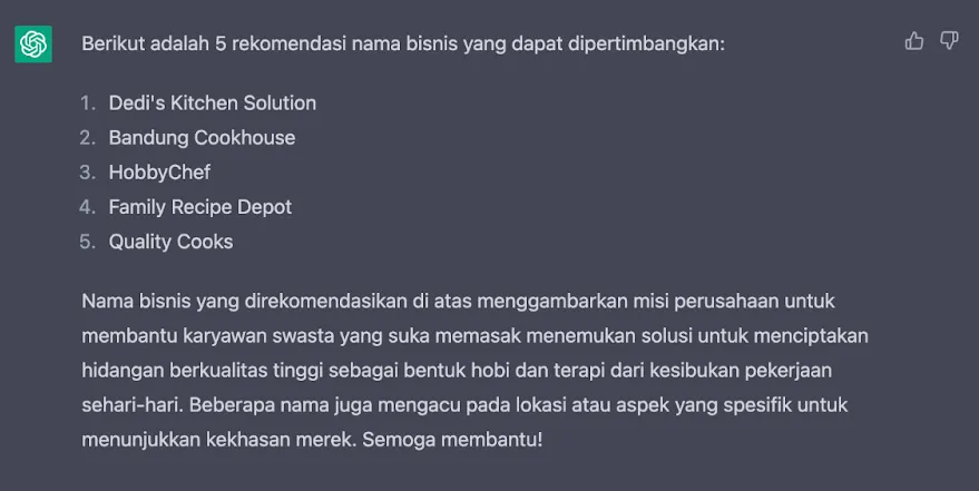 Salah satunya dalam sektor bisnis, teknologi AI Chatbot ChatGPT dapat membantu kita terkait bagaimana mengembangkan bisnis yang baik, menentukan target audience, dan memberitahu bisnis apa yang saat ini sedang dibutuhkan.