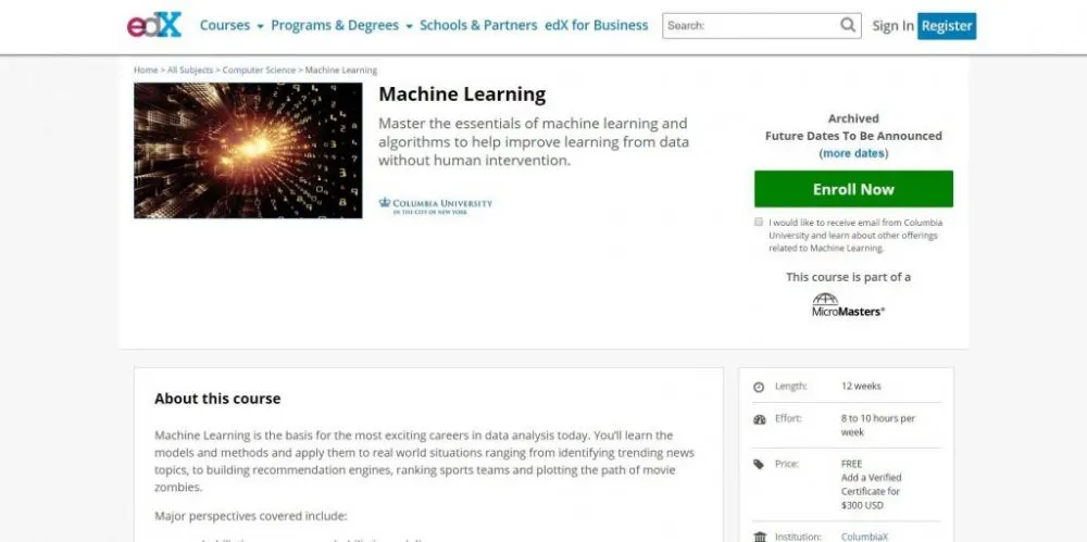 machine learning yang disponsori Universitas Columbia yang tersedia secara Gratis. Ini juga memberi peserta didik pilihan untuk membayar sertifikasi yang akan digunakan sebagai bukti kompetensi.