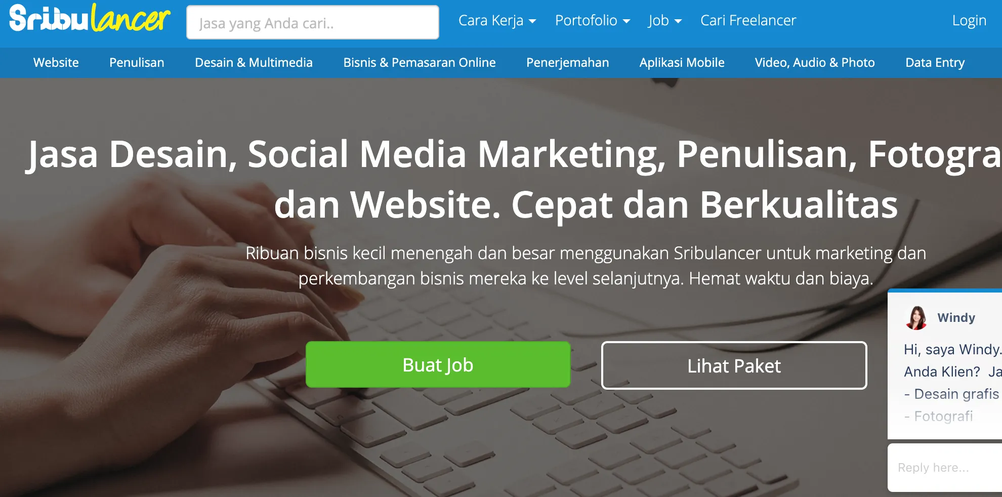 Situs ini membantu kamu menemukan pekerjaan yang cocok sebagai freelancer. Jenis pekerjaannya pun beragam, seperti desain grafis, digital marketing, penulis dan penerjemah, video dan animasi, pemrograman, musik, hingga bisnis dan gaya hidup. Ragam pekerjaan ini bisa kamu sesuaikan dengan kemampuan dan minat, ya.