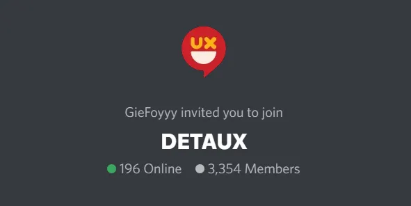 Designers Talk UX atau disingkat DETAUX merupakan salah satu server Discord sebagai tempat berkumpulnya praktisi desainer UX (User Experience) dari seluruh dunia. Dibangun oleh Sidhant Goyal yang juga merupakan Co-Founder dari Designerrs, DETAUX dibentuk dengan tujuan agar menghilangkan kesalahpahaman mengenai dunia desain yang telah diaplikasikan di dunia industri desain saat ini.Komunitas DETAUX ini menyediakan lingkungan belajar yang aman bagi para desainer UX untuk berkembang lebih jauh lagi melalui diskusi, kursus, hingga tantangan yang akan diberikan oleh para admin. Klik link di sini untuk join.
