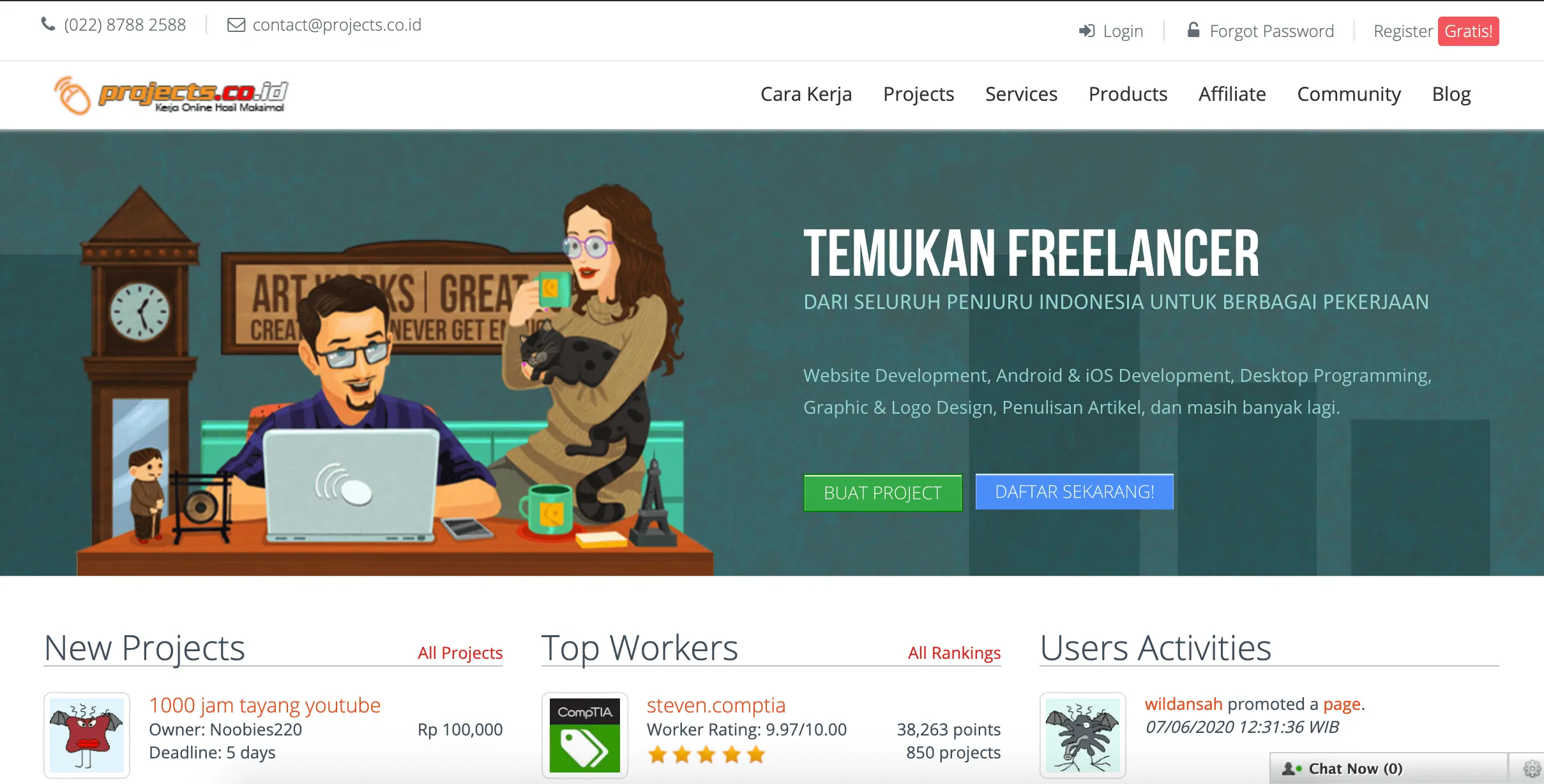 Di situs ini kita bisa mencari pekerjaan freelance yang selalu update setiap hari, berdasarkan lokasi, kategori maupun jenis pembayaran (per jam atau per proyek).