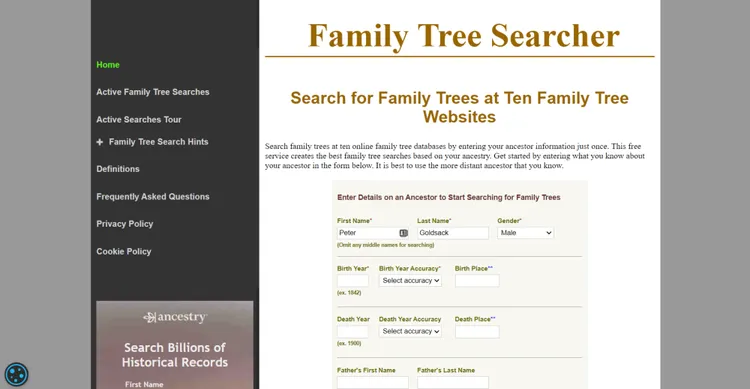 Familiy Tree Searcher adalah situs web yang dibuat oleh peneliti swasta. Situs ini unik karena beberapa sumber adalah kuis interaktif yang memungkinkan kamu mencari data dengan menyesuaikan metode penelitian yang dipilih.