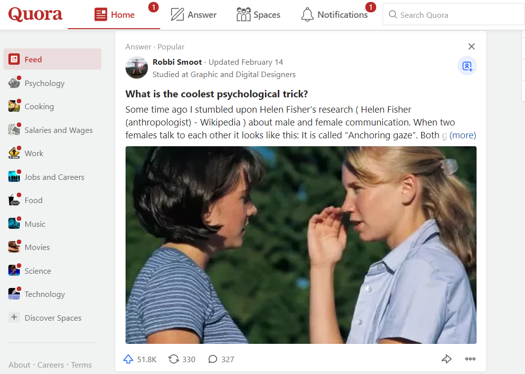 Quora.com merupakan situs tempat tanya-jawab berbagai hal, mulai dari teknologi, psikologi, filsafat, seni, dan lain-lain. Ada banyak kisah dan pengetahuan baru yang bisa kamu dapatkan dari website ini.