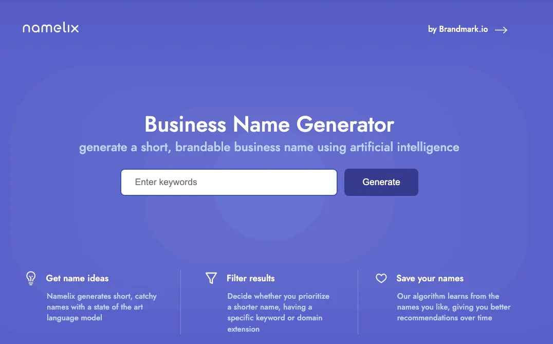 Butuh memikirkan nama baru untuk sebuah proyek atau bisnis? Cukup ketik kata kunci di Namelix, dan kamu akan mendapatkan ratusan ide dan logo.