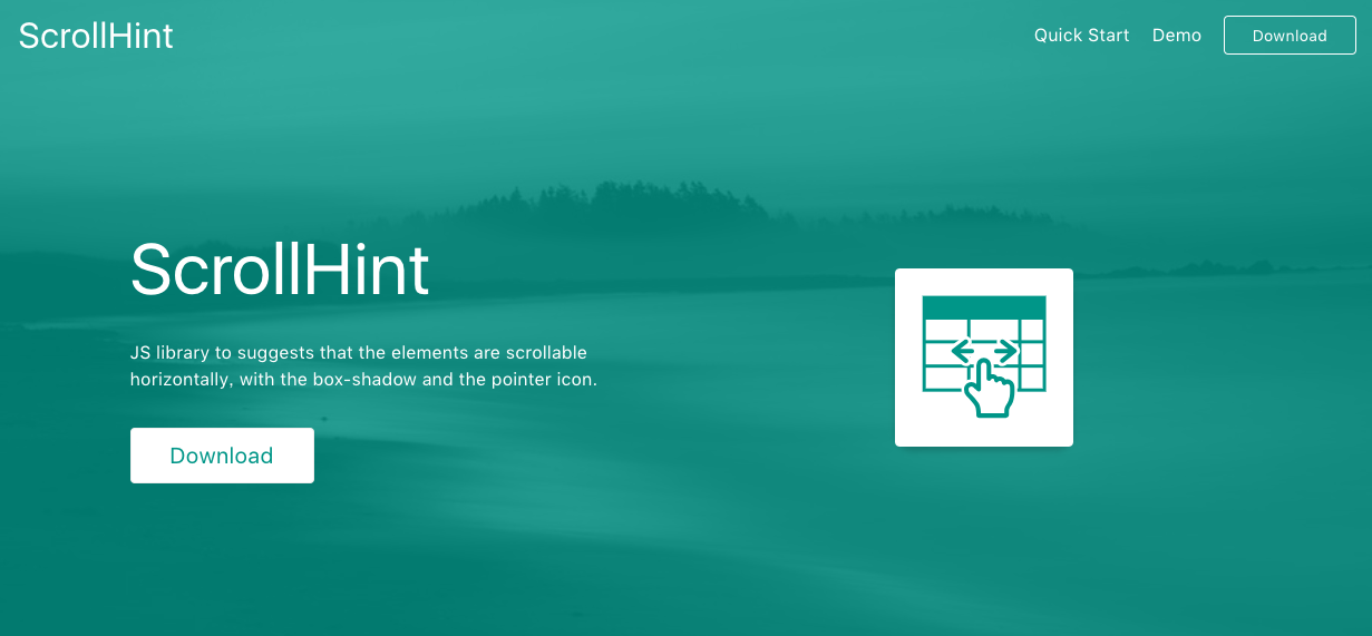 library JavaScript yang ringan dan mudah digunakan yang menampilkan ikon titik untuk menunjukkan bahwa elemen saat ini dapat digulir secara horizontal. Selain itu, juga memiliki kemampuan untuk menambahkan kelas CSS khusus ke elemen yang dapat digulir tergantung pada status saat ini. ScrollHInt berguna untuk menampilkan tabel HTML lebar pada perangkat seluler yang tidak memiliki cukup ruang untuk menampilkan semua kolom.