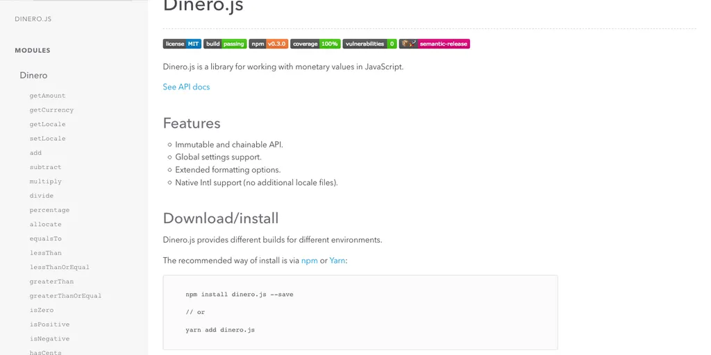 Dinero.js memudahkan untuk membuat, menghitung, dan memformat nilai moneter dalam JavaScript. Kamu dapat melakukan operasi aritmatika, menguraikan dan memformatnya secara ekstensif, memeriksa sejumlah hal untuk membuat proses pengembangan-mu lebih mudah dan lebih aman.