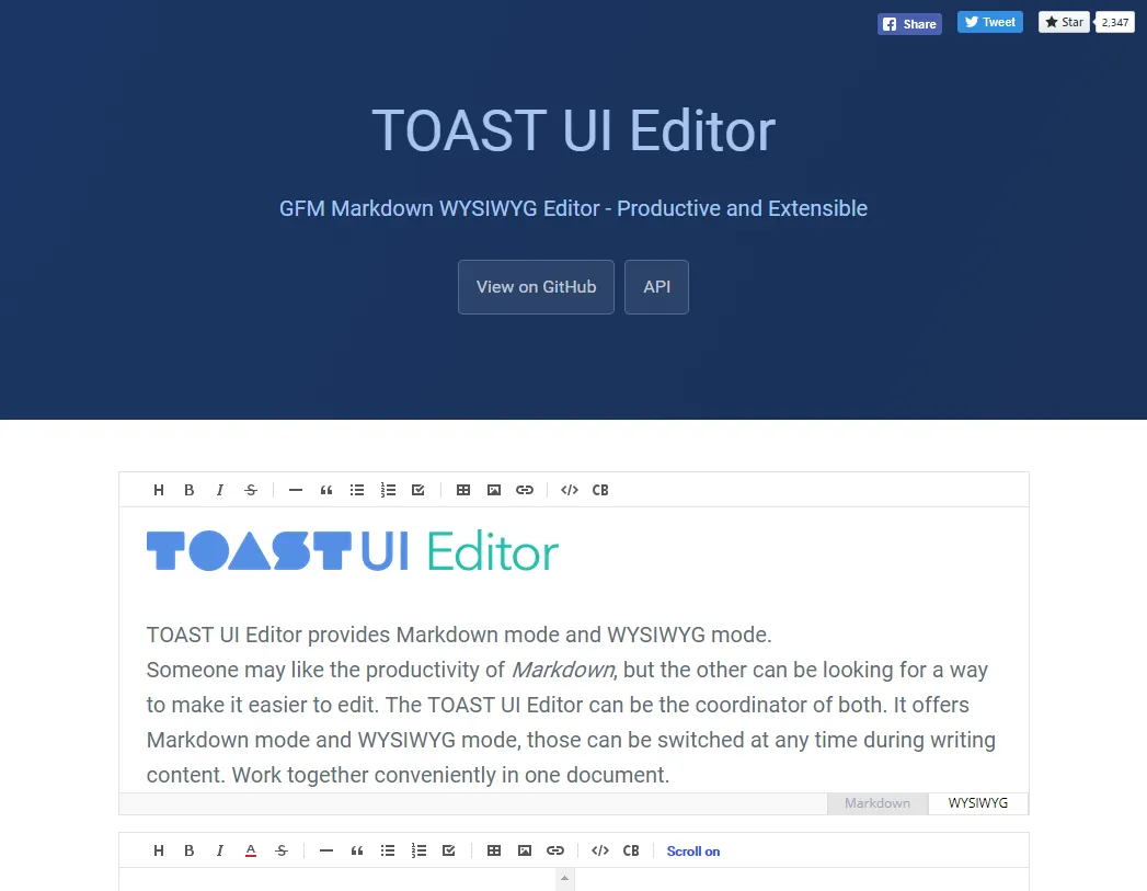 ToastUI Editor adalah editor WYSIWYG yang dapat diperpanjang yang menampilkan fitur GitHub Markdown bersama dengan ekstensi untuk membuat grafik batang yang menarik dan diagram berbasis UML.