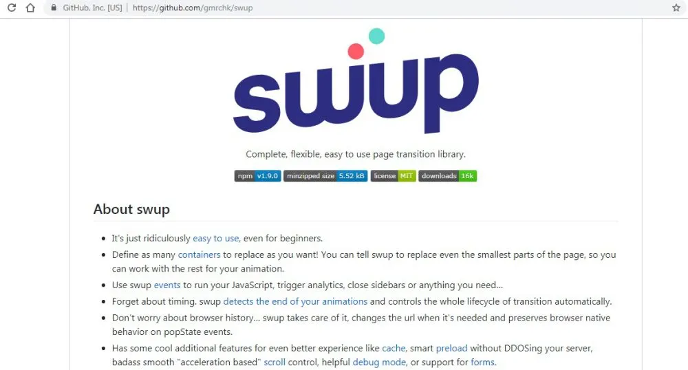 library transisi halaman ramah pemula yang bekerja di sekitar transisi CSS. Kamu dapat menggunakan Swup untuk melakukan tindakan seperti menjalankan JavaScript, memicu analitik, atau menutup sidebars. Jika animasi berbasis JavaScript adalah pilihan-mu, ada ekstensi JavaScript opsional.