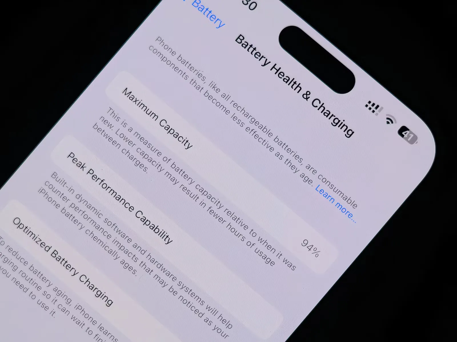 Persentase battery health (kapasitas maksimum baterai menyimpan daya)