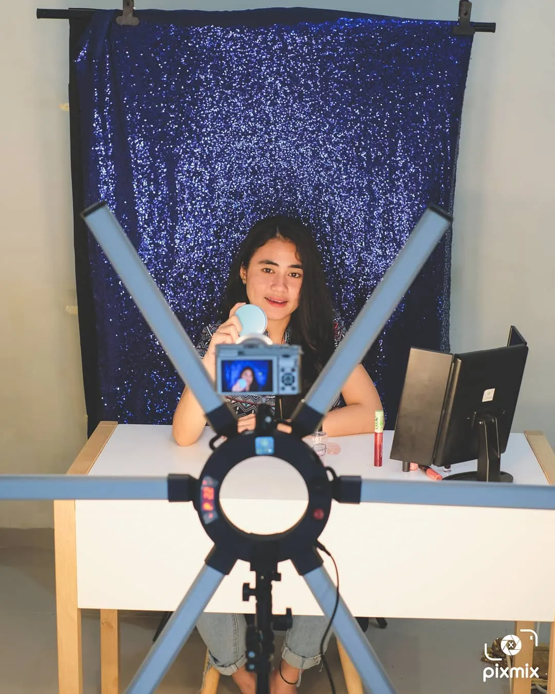 Kamu juga dapat menggunakan kain polos berwarna sebagai latar belakang dalam mengambil foto atau video untuk konten. Kainnya dapat kamu gantungkan atau ditempel di tembok.