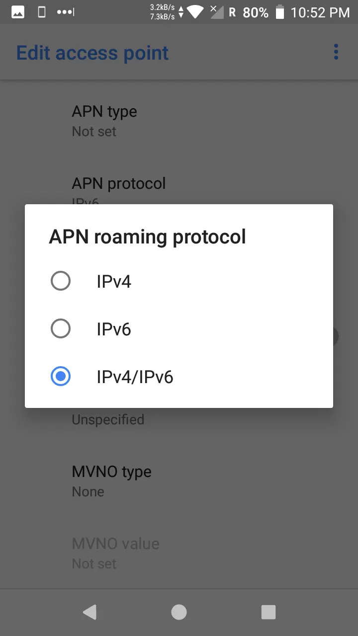 roaming APN, pilih IPv4/IPv6. IPv4/IPv6 merupakan jenis internet protokol yang