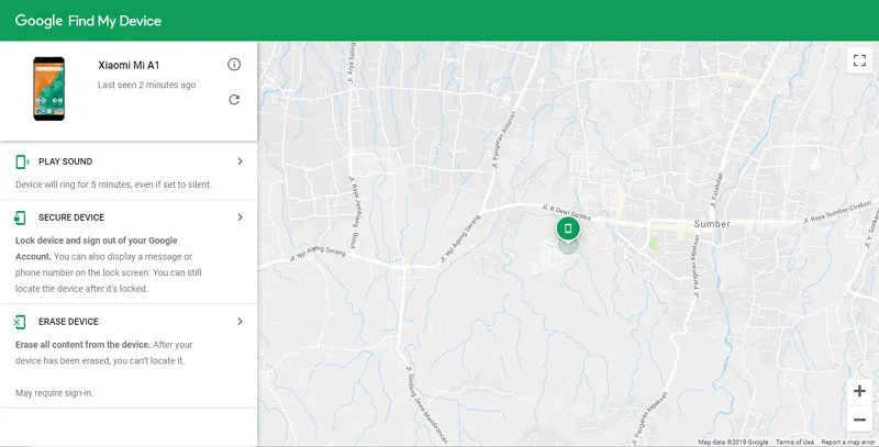 3. Akan ditampilkan beberapa opsi di aplikasi Find My Device, mulai dari Ring my Phone (Play Sound), Secure Device (Amankan Perangat) hingga Erase Device (Hapus Perangkat)